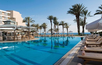 Det firestjernede Pioneer Beach Hotel i Paphos er et hotel med voksen-fokus. Det meste er designet til to, og solstolene på græsplænen mod havet står to og to. Her er fitness og mulighed for afslapning i indendørspoolen. Ved poolområdet ligger baren i centrum, og poolen er omkranset af bekvemme solsenge. Poolhåndklæder udlånes gratis på hotellet.