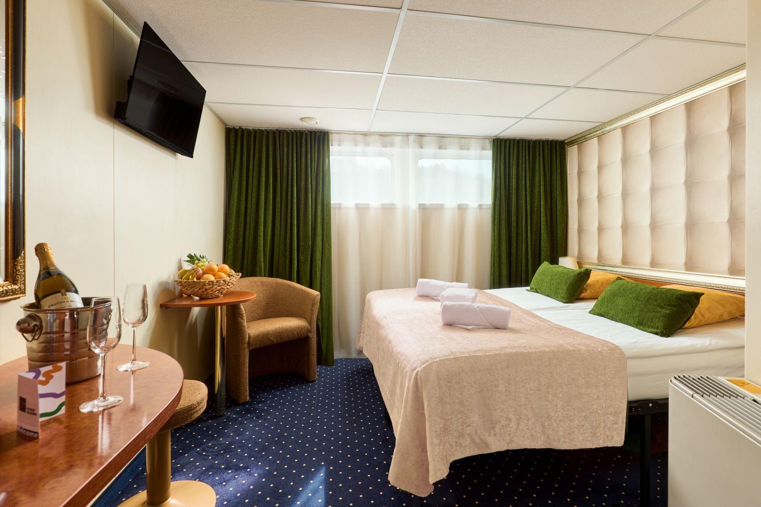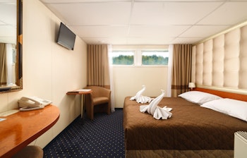 Kahytterne er ca. 14m2 og alle med eget toilet og bad og med enten dobbeltseng eller to enkeltsenge, hårtørrer og lille tv. Kahytterne på lower dæk er med et mindre vindue (kan ikke åbnes), hvor vinduerne i kahytterne på middle dæk kan åbnes. På øvre dæk er der franske døre, der kan åbnes (ikke en balkon). Vi bestemmer ikke udsigten fra kahytterne under sejladsen, og når vi ligger til kaj, kan vinduerne og derved udsigten være ud til kajplads, eller andre sideliggende skibe.