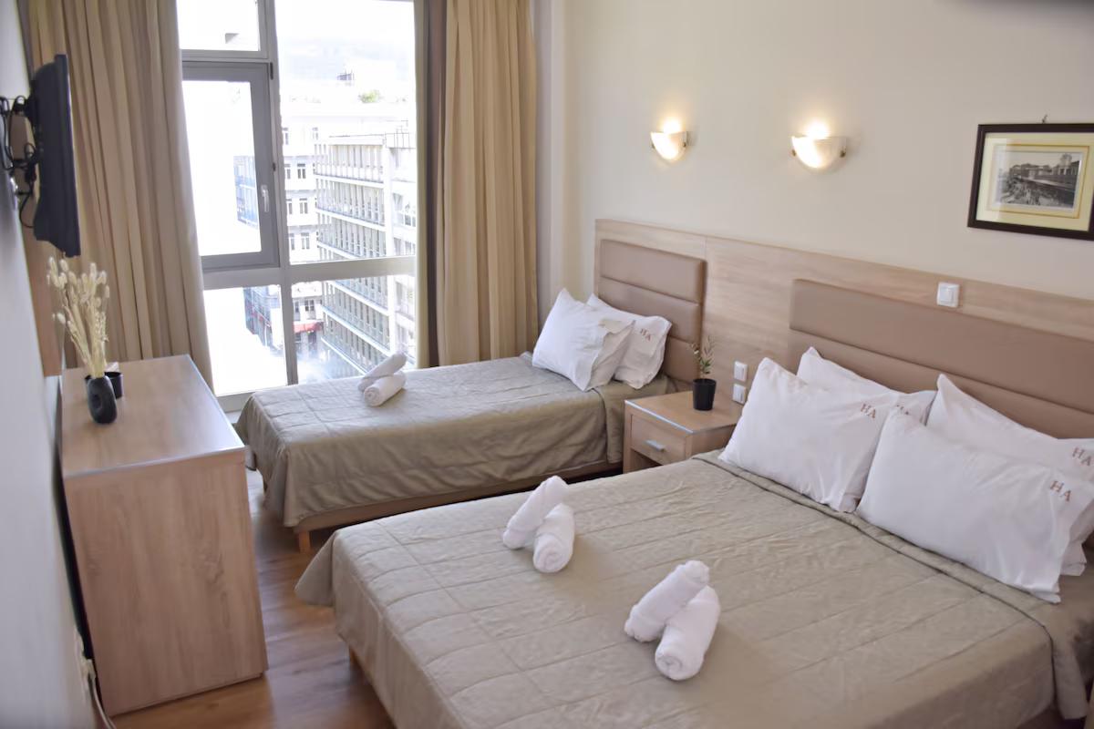 Værelserne er lyse og praktisk indrettet med aircondition, mørklægningsgardiner og køleskab – rart at have i den græske varme. Der er også hurtig wi-fi på alle værelser. På stueetagen finder du en café, hvor du kan få kaffe og en pause mellem sightseeing.