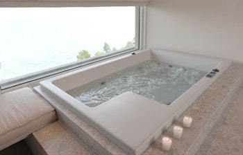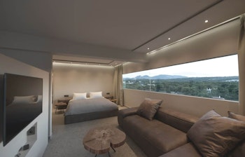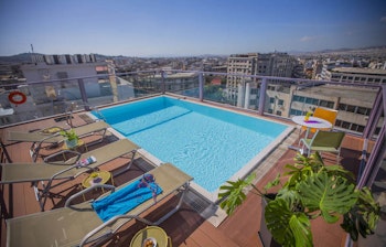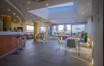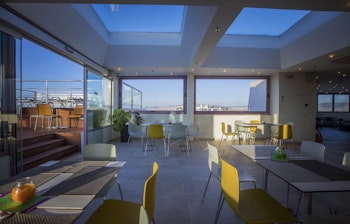 Morgenmaden serveres i stedet loungebar, som har udsigt over Athen. På ottende etage finder du tagterrassen med loungemøbler og små oliventræer.