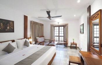 Vi bor i elegante værelser i kategorien Punnamada Room med store vinduer, der lukker masser af naturligt lys ind. Alle værelser er indrettet med moderne træmøbler og har aircondition, tv og eget badeværelse med bruser og toiletartikler.