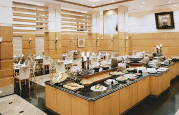 Hotellets restaurant serverer en bred vifte af internationale retter, herunder asiatiske, indiske, mellemøstlige og europæiske køkkener.