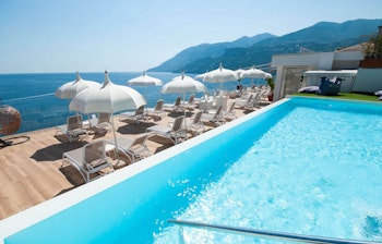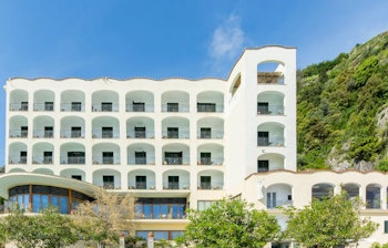 Også udefra er hotellet et imponerende syn, da det er bygget direkte ind i klippesiden ved kystvejen i udkanten af Maiori. Hotellet ligger forholdsvis højt, ca. 200 meter fra strandpromenaden og det hyggelige centrum, som er en strækning, der skal tilbagelægges til fods.