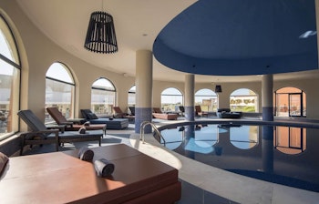 Netop poolen er stor og placeret i hjertet af haven med talrige liggestole og parasoller hele vejen rundt om den. Der er også en poolbar med borde og stole, mens wellness-entusiaster kan se frem til at besøge det lækre spaområde, hvor der er indendørs pool (med krav om brug af badehætte), fitnessrum, tyrkisk dampbad og mulighed for at bestille massage.