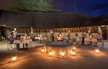 Vi nyder autentiske sydafrikanske middage i lodgens traditionelle boma – en udendørs spiseplads oplyst af lejrbål og stjernehimmel, mens nattens lyde fra bushen omgiver os.